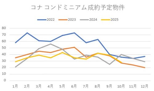 2024年の夏以降継続中の「コンドミニアム保険問題」で一時停滞した需要ですが、2025年はやや回復傾向にあります。歴史的に見ると、8月までがピークとなるのが通例。2025年の動きは2023年水準に戻ったものの、2024年よりは依然として低め。10月の成約物件数は28戸と、9月の39戸から減少しました。これは例年通り、いわゆる閑散期に入ったことによるものです。