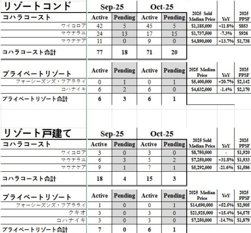 各リゾートの動向では、マウナ・ラニが最も活発。成約数と売り物件数が1:1のバランスとなっており、価格調整が進んだ影響が大きいとみられます(ただし中間価格は前年比で9.8%減)。一方、ワイコロア・リゾートは価格調整が進まず、成約と在庫の比率は9:1と低迷中。マウナ・ケア・リゾートは依然として「ブティック市場」で売り物件数が少なく、良いものは高値で取引されています。ここでも精度の高い価格設定が鍵を握ります。