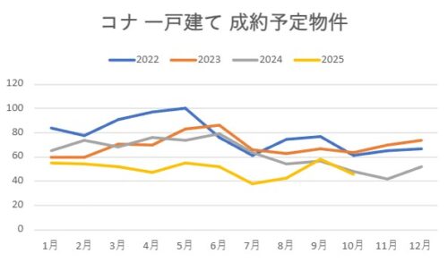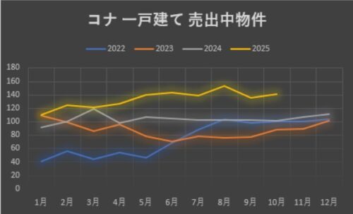 在庫面では、2024年初めから2025年3月にかけて増加が続いたものの、7月以降は減少傾向。10月の売り物件数は153戸で、年末には2024年を下回る可能性もあります。