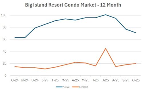 10月末時点のハワイ島市場は、セクターごとに異なる動きを見せています。コンドミニアムは在庫減少によりバランスを回復しつつあり、戸建て市場は供給増加により中立的な地合いへと変化中。そして、リゾート物件、特に高額帯は引き続き高値圏でも売買が成立しています。